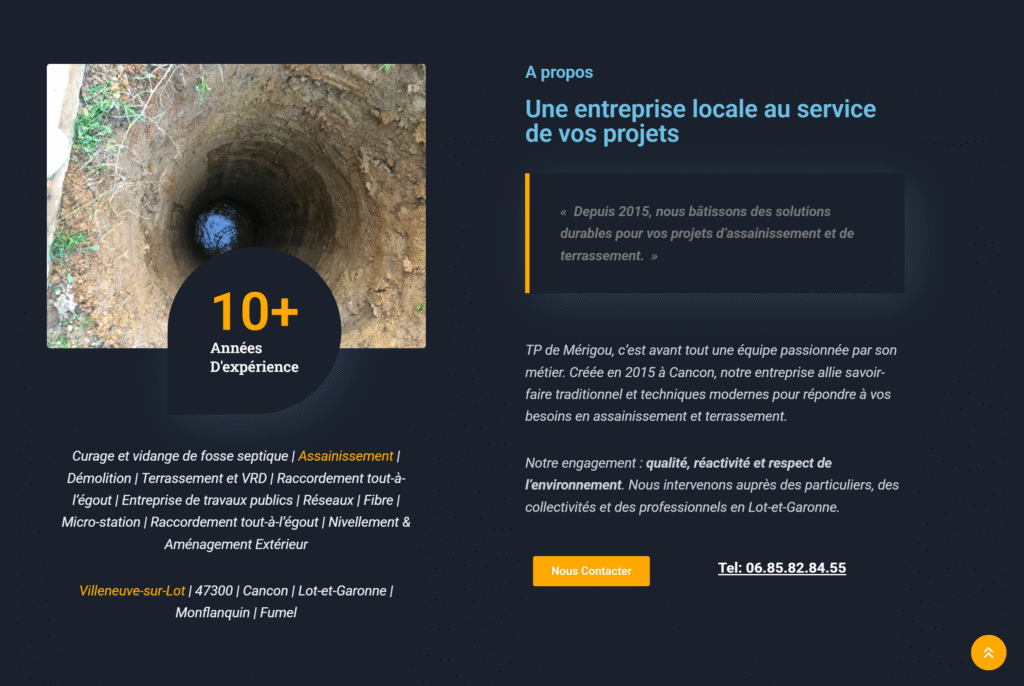 TP de Mérigou, spécialiste de l’assainissement et du terrassement à Villeneuve-sur-Lot, avait besoin d’une identité visuelle moderne et d’un site web performant pour :