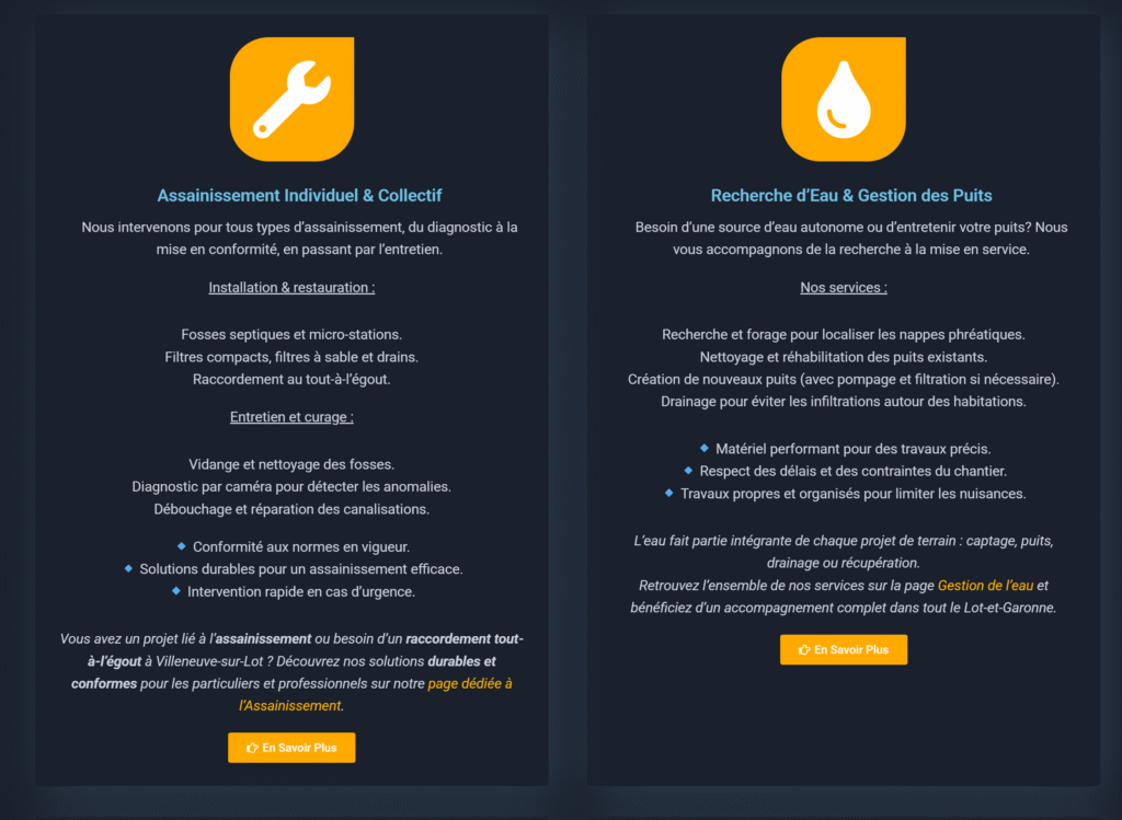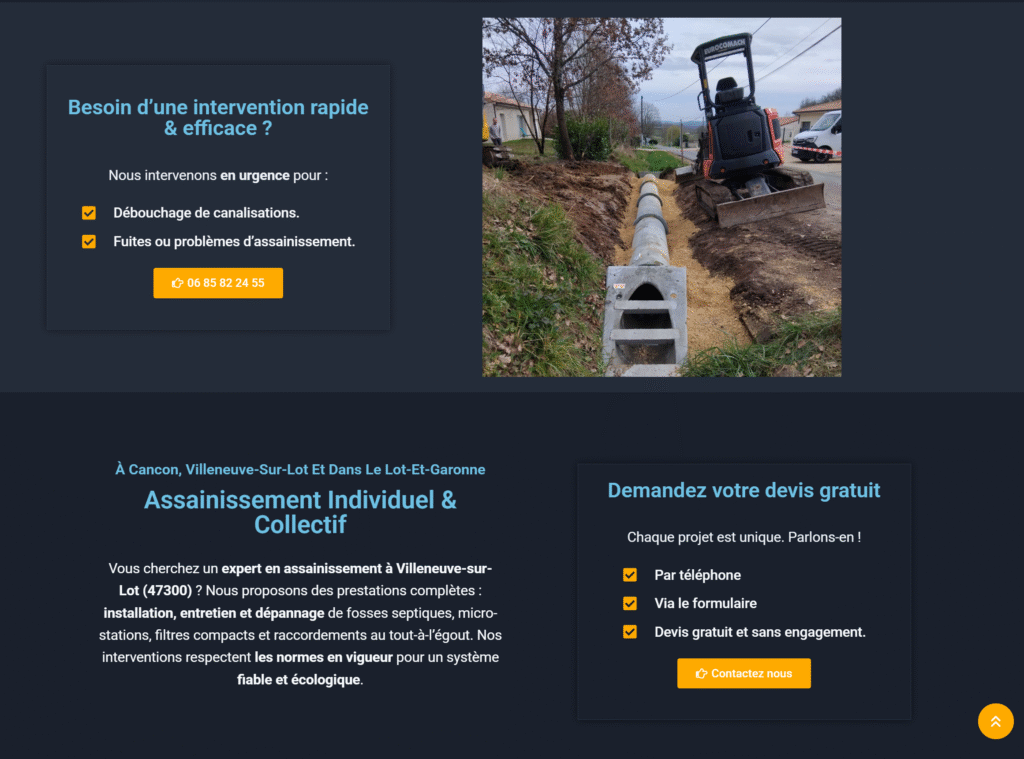 Optimisé pour le SEO local (mots-clés comme « assainissement Villeneuve-sur-Lot »).